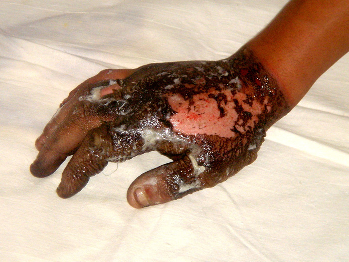 Рис. 4. Опік полум’ям III ступеня/1% правої кисті й передпліччя (deep dermal burn).