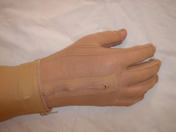 Рис. 13. Використання компресійної терапії.гіпертрофічних рубців правої кисті за допомогою спеціального одягу.