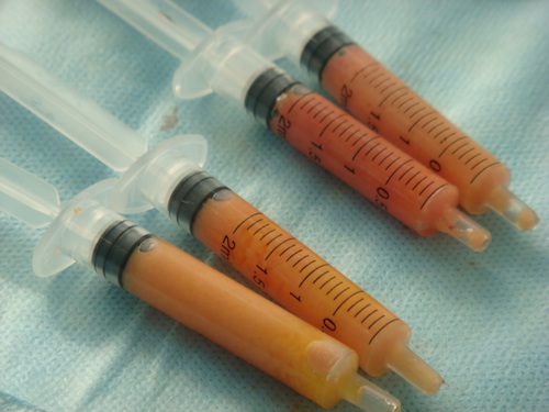 В шприц поступает эксфузат, содержащий жировую ткань, масло, введенный раствор и кровь. Для дальнейшего введения жир нужно очистить от примисей, содержащихся в эксфузате.