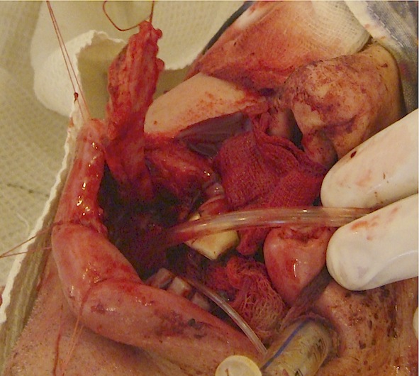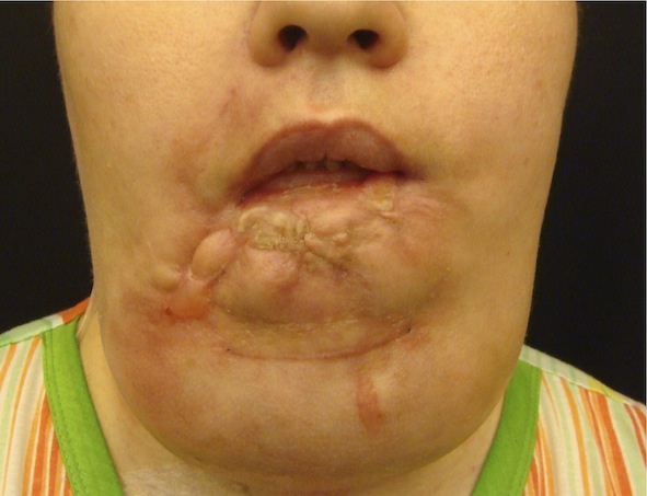 Пациентка Л. 27 лет. Восстановление утраченной нижней губы комбинацией дерматензионного субментального лоскута и двух билатеральных FAMM лоскутов с нижним основанием. Раневой дефект при поступлении в клинику. Этап дермотензии субментального лоскута.