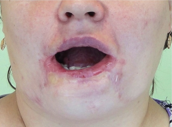 Пациентка Л. 27 лет с утратой нижней губы вследствие некротической формы рожистого воспаления. Полностью отсутствуют ткани нижней губы, обнажен подбородочный выступ нижней челюсти. Восстановление кожного покрова утраченной нижней губы проведено дермотензионным кожно-подкожным субментальным лоскутом. Восстановление слизистого слоя утраченной нижней губы проведено путем билатеральной пластики мышечно-слизистыми лоскутами на лицевой артерии с нижним основанием.