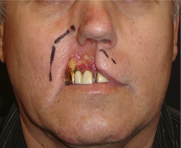 Рекомендуемое онкологами обширное иссечение исключает возможность применения кросс-лоскута с нижней губы или локальных лоскутов.