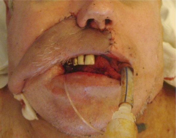 Восстановление утраченного кожного покрова проведено путем использования дермотензионного субментального кожно-подкожного лоскута, а восстановление слизистого слоя верхней губы выполнено правосторонней пластикой FAMM лоскутом с верхним основанием.
