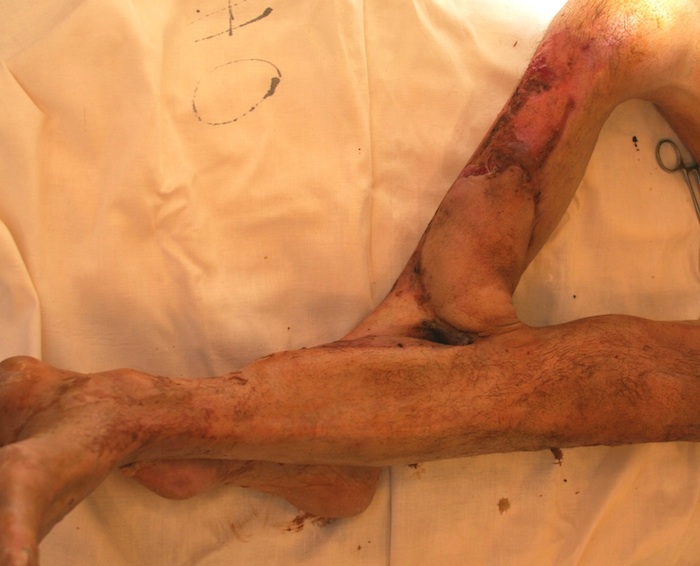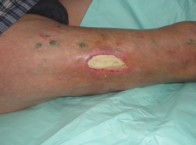 Рис 9. Цифровое фото голени после первого этапа пластики кросс-лоскутом на временной питающей ножке, сформированным на контрлатеральной конечности.