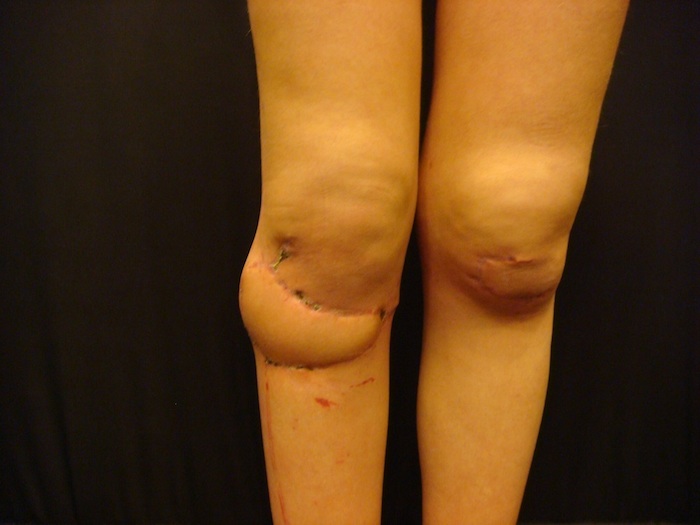 Края раны в реципиентной зоне сопоставлены с кожными краями лоскута и ушиты, дефект донорской зоны закрыт путем сближения краев и наложением линейного шва без натяжения кожи (Рис. 15). Послеоперационное течение гладкое. После заживления раны выписан к труду на 14 сутки после операции. После радикальной экстирпации раны на голени путем пластики PPPF сформирован устойчивый кожный покров, максимально близкий по структуре и цвету утраченному вследствие травмы.