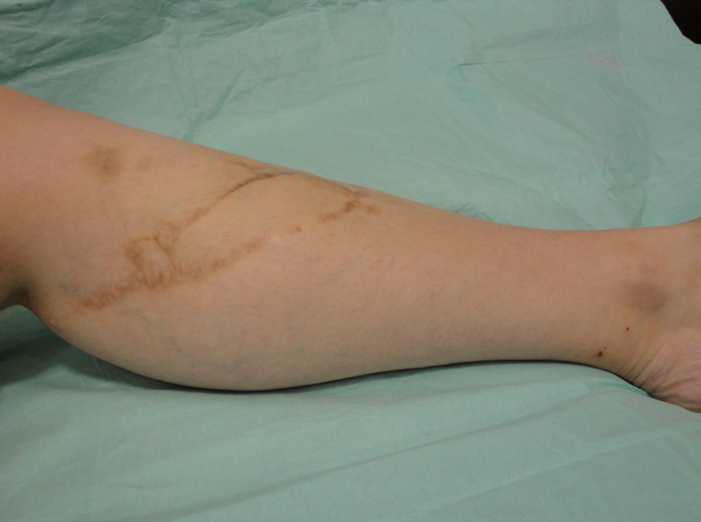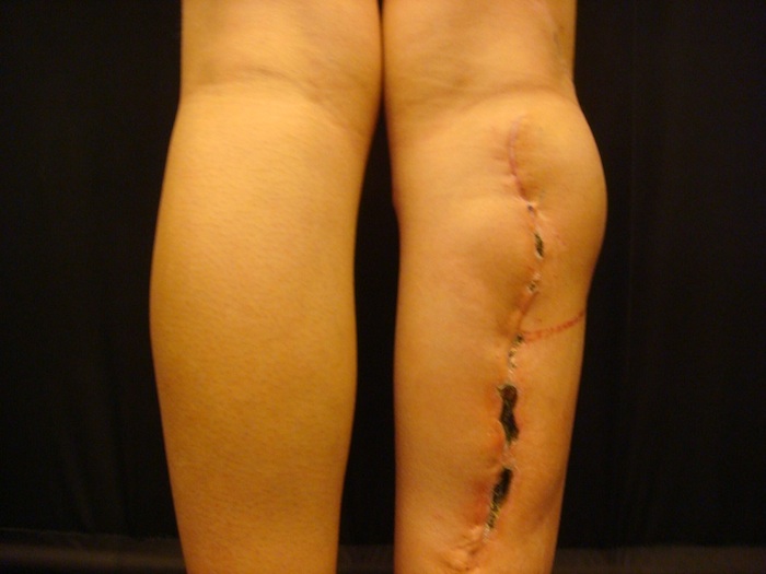 Проведено широкое иссечение новообразования в пределах неизмененных тканей радиоволновым методом Surgitron, гемостаз. В область дна раневого дефекта, размерами 10 х 9 см. предлежит большеберцовая кость, что является показанием к закрытию раны васкуляризированным лоскутом (Рис. 8А). После дессекции и выделения намеченный лоскут поднят, проведена визуализация перфорантов формирующих питающую ножку PPPF (Рис 8Б). Сам лоскут ротирован аксиллярно на 180 град. (Рис 8В), где адаптирован к краям раневого дефекта и фиксирован узловыми швами.1 Рана в реципиентной зоне сопоставлена с кожными краями лоскута и ушита, дефект донорской зоны закрыт путем сближения краев и наложением линейного шва. При этом важным моментом является соблюдение основного принципа пластической хирургии – ушивание раны без натяжения кожи. Послеоперационное течение гладкое. После заживления ран и верификации диагноза в гистологической лаборатории пациентка выписана к труду на 27 сутки после операции. После удаления обширного новообразования на голени путем пластики PPPF сформирован устойчивый кожный покров, максимально близкий по структуре и цвету утраченному вследствие заболевания, без значительного нарушения контуров конечности как в донорской, так и в реципиентной зоне. Пациентка полностью удовлетворена результатом лечения (Рис 8Г).