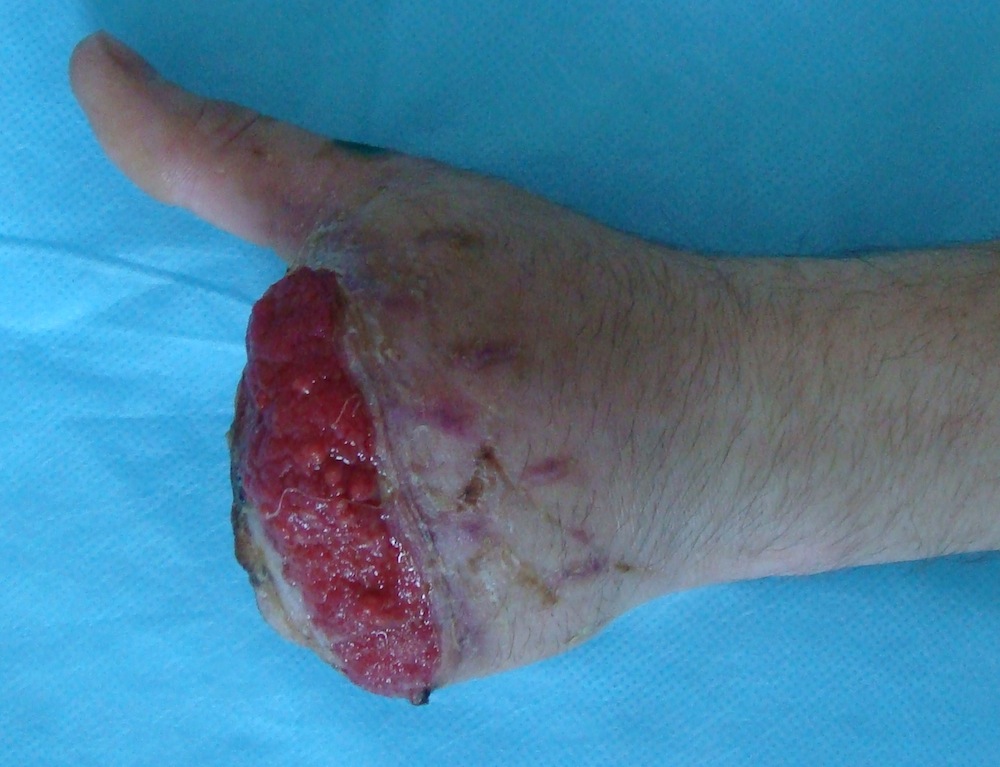 Случай 1. Пациент П-в., 27 лет. Был направлен на лечение в специализированный центр на 27 сутки после травмы кисти с диагнозом: Рана гранулирующая культи левой кисти. Травматический отрыв II-III-IV-V пальцев левой кисти на уровне метакарпальных костей (Рис. 5АБ).