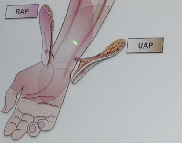 Фото. 6. А – варианты формирования островковых лоскутов пропеллер на питающей ножке, состоящей из выделенных изолированных перфорантных сосудов (perforator pedicle propeller flap – PPPF) из бассейнов лучевой (RAP)и локтевой артерий (UAP) для пластики дефектов кожи и мягких тканей в области кисти. Б – цифровое фото перемещенного на рану культи кисти островкового кожно-фасциального пропеллер лоскута (PPPF) на перфоранте из басейна локтевой артерии. В,Г – результат демонстрирует восстановленную функцию захвата кисти в области первого межпальцевого промежутка.