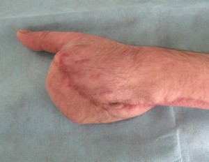 В клинике проведена диагностика повреждения. Определена зона иссечения патологических грануляций, выполнена обработка торцов метакарпальных костей, лоцированы перфорантные сосуды – UAP (Рис. 6А), намечен дизайн кожно-фасциального перфорантного пропеллер лоскута, размерами 15 х 4 см, который после диссекции и визуализации сосудов питающей ножки ротирован аксилярно на 180 град., адаптирован на подготовленном раневом реципиентном ложе. Рана закрыта полностью без натяжения тканей. Донорская зона закрыта путем наложения линейного шва. Послеоперационное течение без особенностей. Пациент выписан на 25 сутки после поступления.