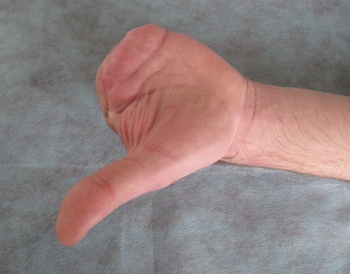 Наблюдение через 12 месяцев (Фото 6Б) демонстрирует полное восстановление кожного покрова культи кисти, пересаженный лоскут по толщине и цвету не отличается от покровных тканей кисти, обладает подвижностью и износостойкостью к механическим воздействиям, легко берется в складку. Кисть включена в повседневную и производственную активность, восстановлен захват кисти в области первого межпальцевого промежутка (Рис. 6 ВГ).