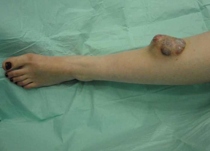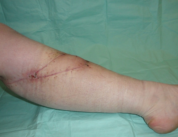 Рис. 8. А – цифровое фото раневого дефекта на голени после иссечения новообразования.