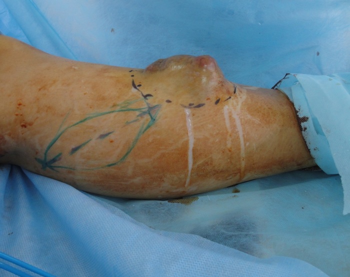 Случай 2. Пациентка П-о., 22 лет. Была направлена на лечение в специализированный центр по решению консилиума онкологов, с рекомендациями широкого иссечения новообразования с одномоментной пластикой. Диагноз: Гемангиома обширная левой голени, рецидив. (Рис. 7А). Ранее в течении двух лет неоднократно проводилось хирургическое лечение гемангиомы путем ее коагуляции, с последующими рецидивами. Определена зона иссечения в пределах здоровых тканей. Методом допплера лоцированы перфорантные сосуды, на медиальной поверхности голени в верхней 1/3 намечен дизайн кожно-подкожного перфорантного пропеллер лоскута (PPPF) на базе перфоранта из бассейна задней большеберцовой артерии (Рис. 7Б).