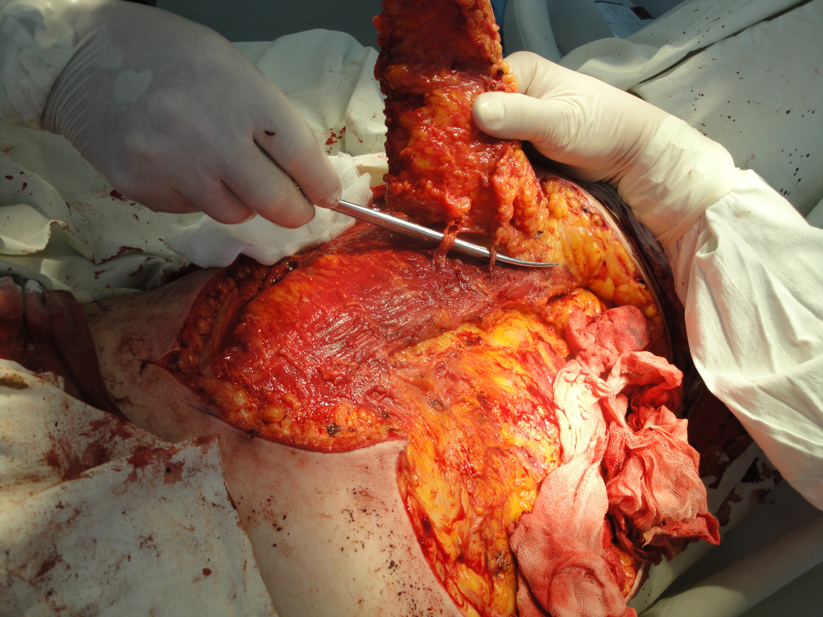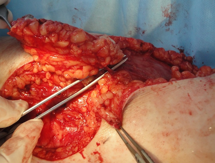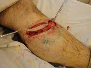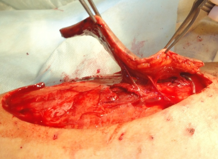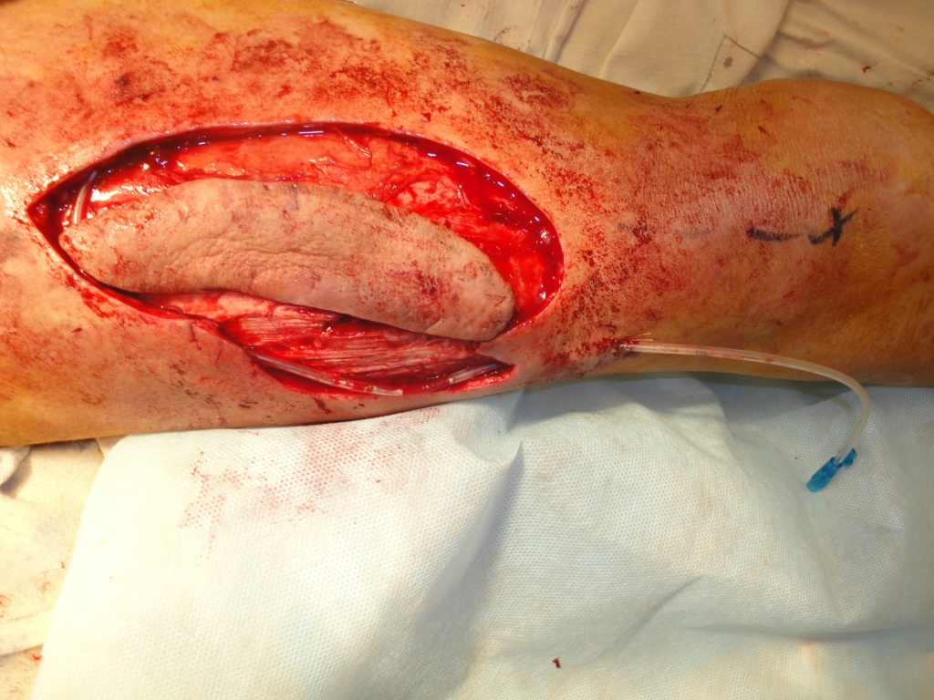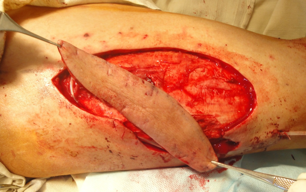 После выполнения ревизии раны с радикальным дебрайдментом, намеченный кожно-фасциальный лоскут, размерами 13х4 см, выкроен как островковый (Рис.25) и поднят, для визуализации перфорантного сосуда, формирующего питающую ножку PPPF (Рис 26).