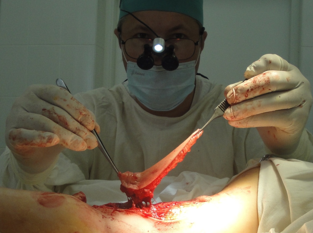 Рис. 4Г. Цифровое фото после полной дессекции и подъема передне-латерального лоскута бедра на сосудистой питающей ножке (perforator pedicle propeller flap – PPPF) (справа).