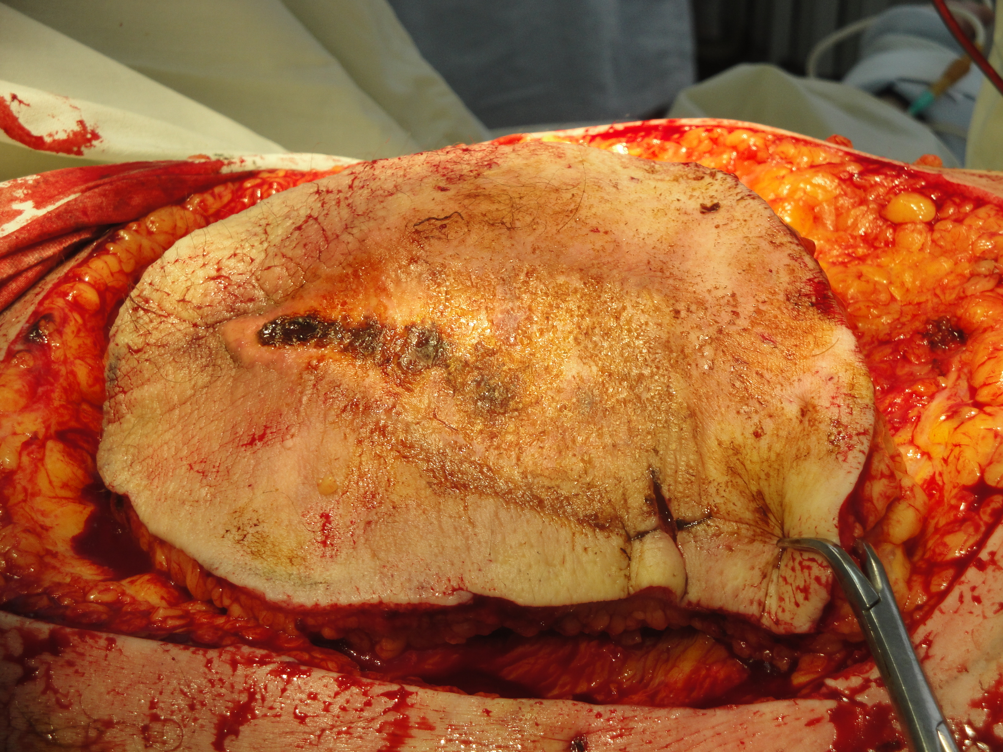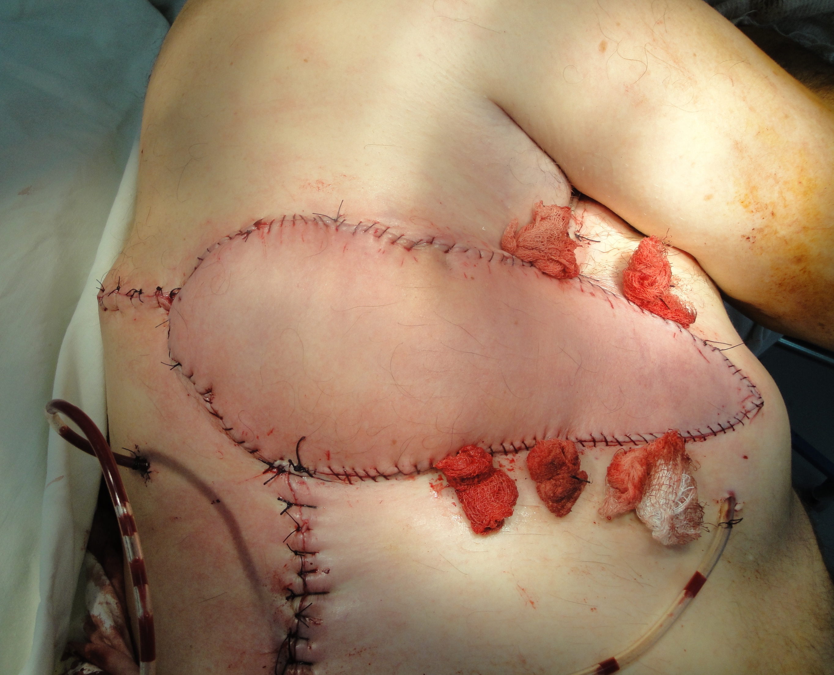 Рис. 28. Интраоперационное цифровое фото на этапе адаптации лоскута к краям раны и ушивания кожи без натяжения; использован шовный материал викрил-плюс 4 . Подлоскутное пространство дренировано вакуум дренажом (справа).