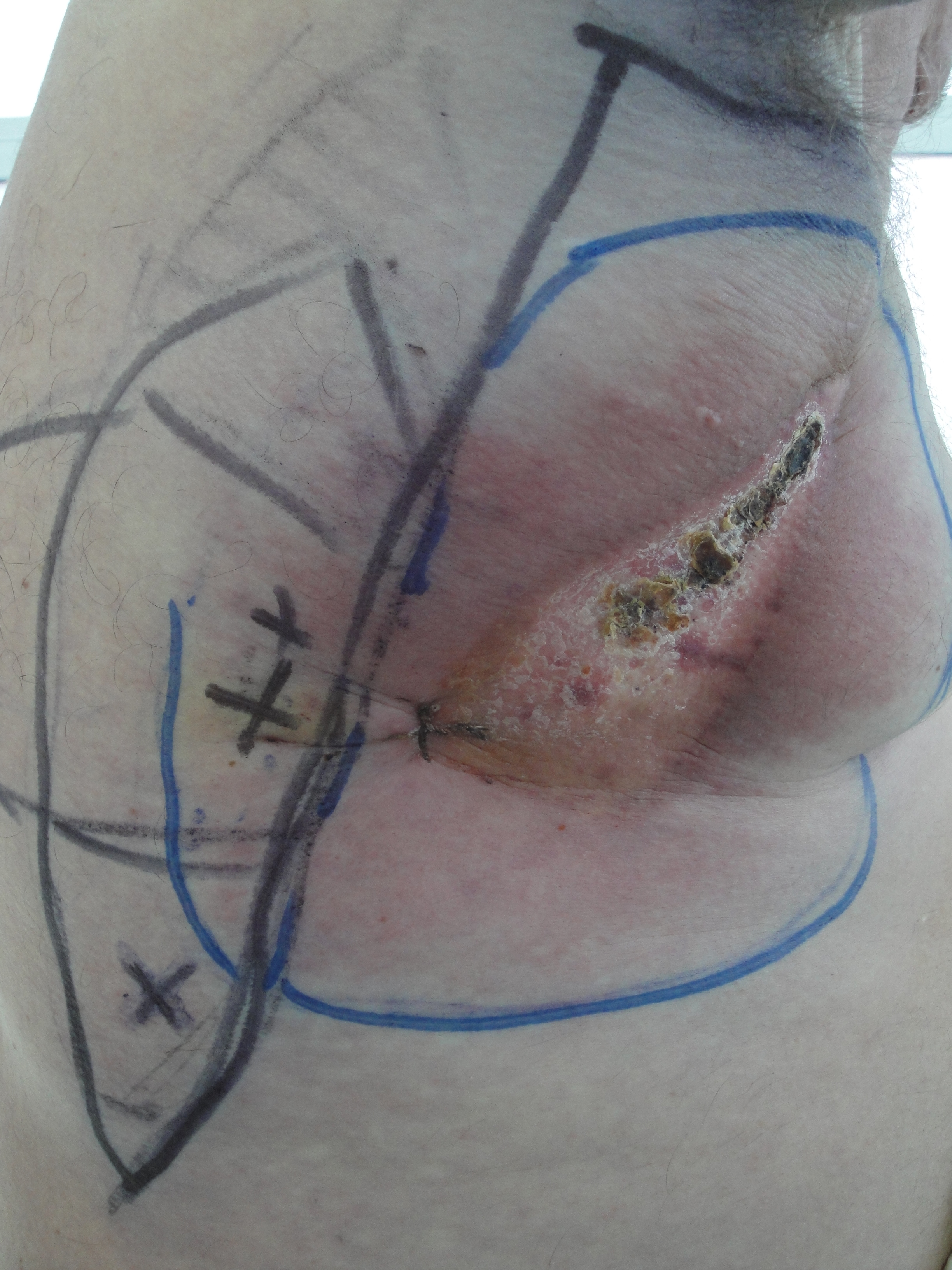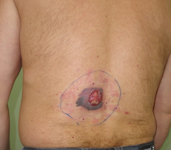 Рис.29. Цифровое фото новообразования на коже в поясничной области до лечения; намечена зона иссечения в пределах неизмененных тканей (слева).