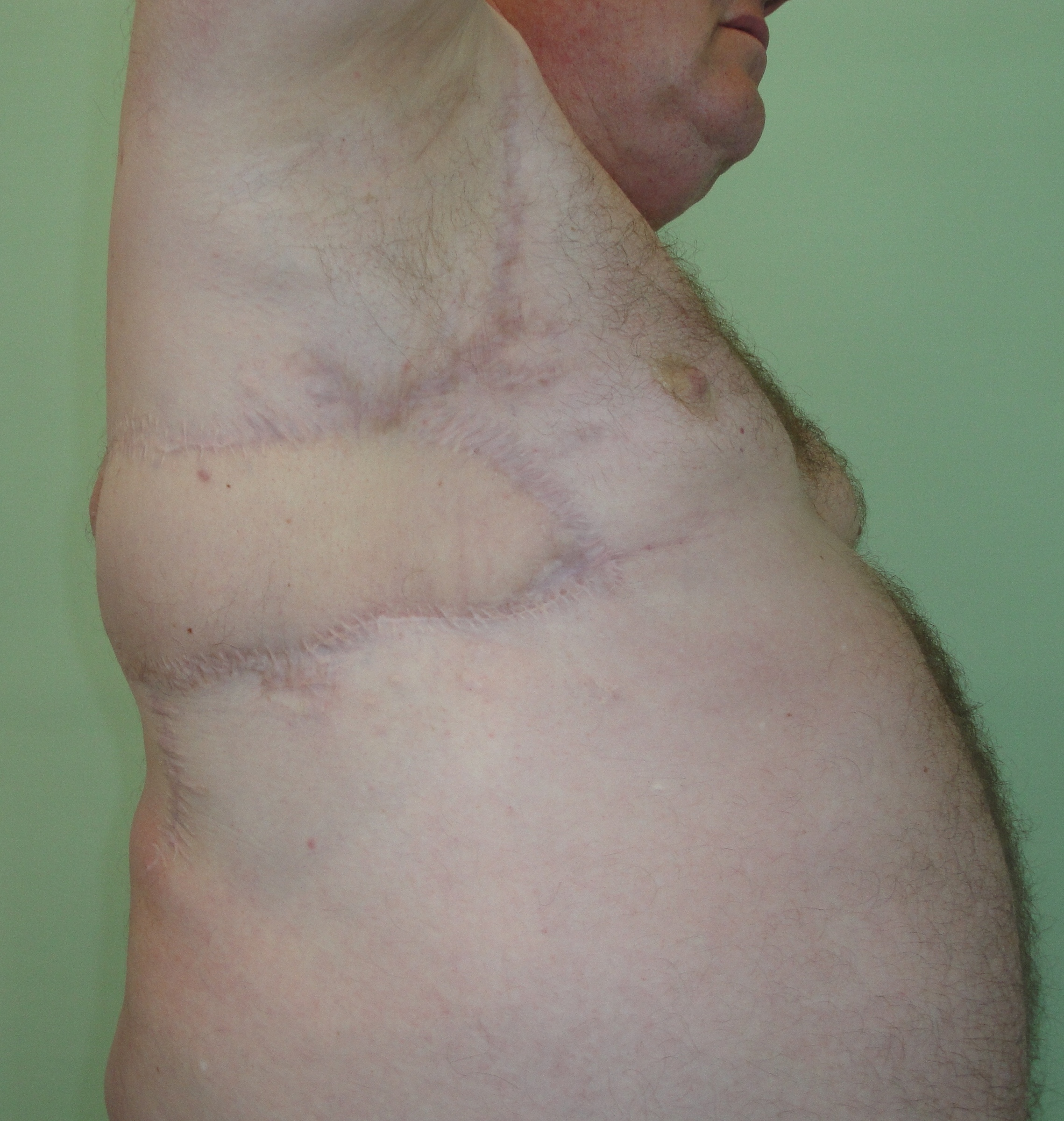 Рис.22. Цифровое фото новообразования на боковой поверхности грудной клетки до лечения (слева) и вновь сформированный путем пластики лоскутом кожный покров через 12 месяцев (справа).