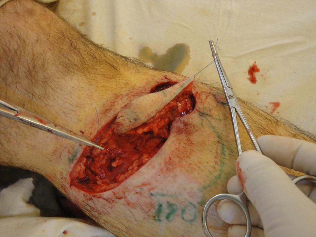 Проведено широкое иссечение раны в пределах неизмененных тканей радиоволновым методом Surgitron, гемостаз. В области дна раневого дефекта, диаметром до 3 см. предлежит и прощупывается гребень большеберцовой кости, что является показанием к закрытию раны васкуляризированным лоскутом. После дессекции и выделения намеченный лоскут, размерами 3х10 см поднят, проведена визуализация перфорантного сосуда, формирующего питающую ножку PPPF (Рис 13). Сам лоскут ротирован аксиллярно на 180 градусов (Рис 14), где адаптирован к краям раневого дефекта и фиксирован узловыми швами (Викрил-плюс 4 ).