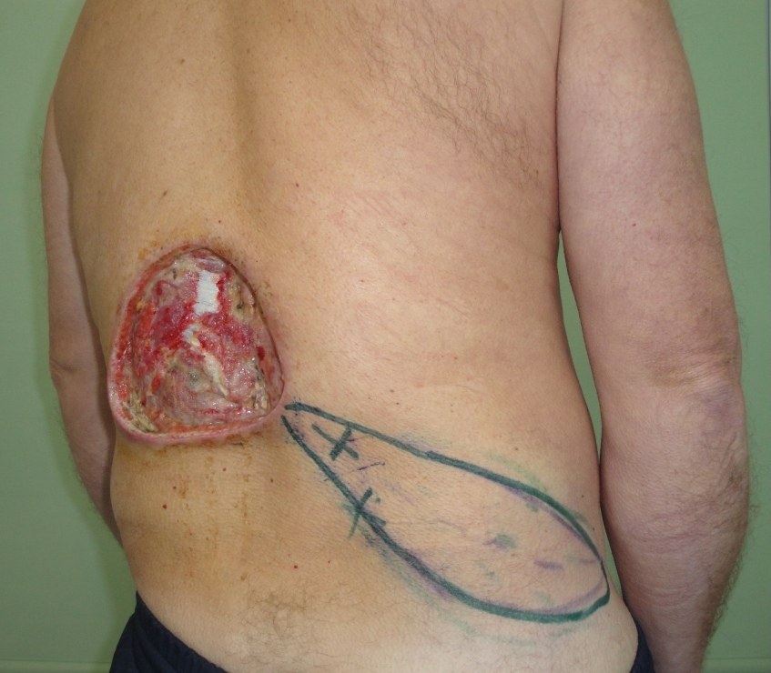 Случай 6. Пациент А-ко., 49 лет. Был направлен на лечение в специализированный центр по решению консилиума онкологов с рекомендациями широкого иссечения новообразования и пластикой утраченных покровных и мягких тканей. Диагноз: Заболевание мягкий тканей туловища (Рис. 29). Определена зона иссечения в пределах здоровых тканей, размерами 18х12 см. в поясничной области слева. Экстирпация опухоли выполнена онкохирургом. Методом допплера лоцированы перфорантные сосуды в поясничной области справа, прилежащей к новообразованию и намечен дизайн кожно-подкожного перфорантного пропеллер лоскута (PPPF) на базе поясничной артерии (lumbar artery perforator) (Рис.30).