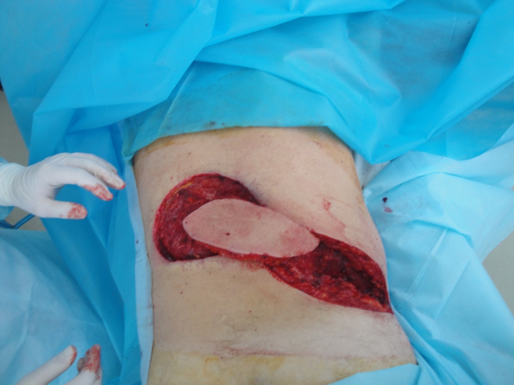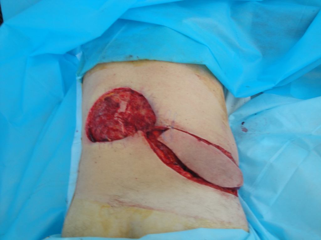 После выполнения ревизии раны с радикальным дебрайдментом, сформировался раневой дефект размерами 18х12 см. и глубиной 1,5-2,0 см. в поясничной области слева. Кожно-фасциальный лоскут, размерами 17х8 см, выкроен как островковый (Рис.31) и после визуализации перфорантного сосуда, формирующего питающую ножку, ротирован аксилярно на 180 градусов (Рис 32).