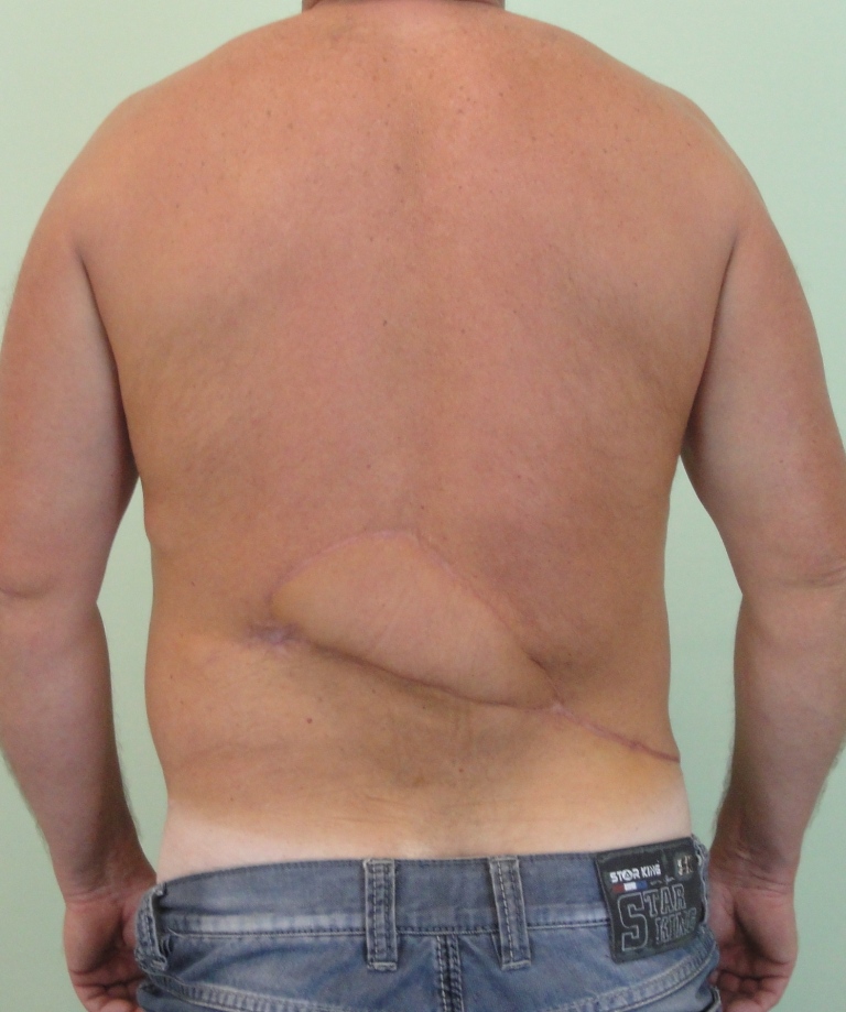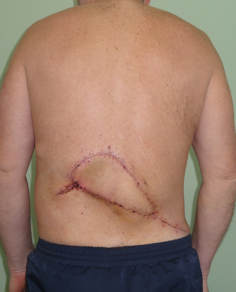 Рис. 33. Цифровое фото поясничной области после завершения этапа хирургической реконструкции и снятия швов (12 сутки после операции). Полное восстановление кожного покрова и объема мягкий тканей без выраженной деформации донорской и реципиентной зон (слева).