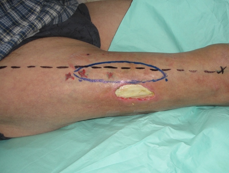 Случай 5. Пациент М-в., 73 лет. Был направлен на лечение в специализированный центр в связи с наличием незаживающей раны бедра. Ранее в течении месяца лечился стационарно в хирургичеком отделении с дагнозом: рожистое воспаление, булезно-некротическая форма. Там же произведена дренирующая некротомия. При поступлении имеет место рана округлой формы, размерами 4х8 см., дном которой является некротизированная широкая фасция бедра (некротический фасциит). Края раны подрыты, определяется отслойка кожи до 2-3 см в стороны от краев самой раны по уровню фасции (Рис. 23). В клинике определена зона иссечения раны в пределах здоровых тканей. Методом допплера лоцированы перфорантные сосуды, на передне-латеральной поверхности бедра в средней 1/3 и намечен дизайн кожно-подкожного перфорантного пропеллер лоскута (PPPF) на базе перфоранта из бассейна глубокой артерии бедра (a.profunda femoris) с планом его разворота вокруг сосудистой ножки на 30 градусов (Рис. 24).