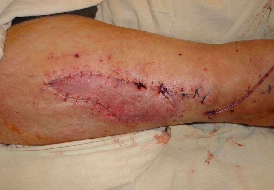 Рис. 21. Цифровое интраоперационное фото раневого дефекта после транспозиции PPPF лоскута и наложения швов на кожу.