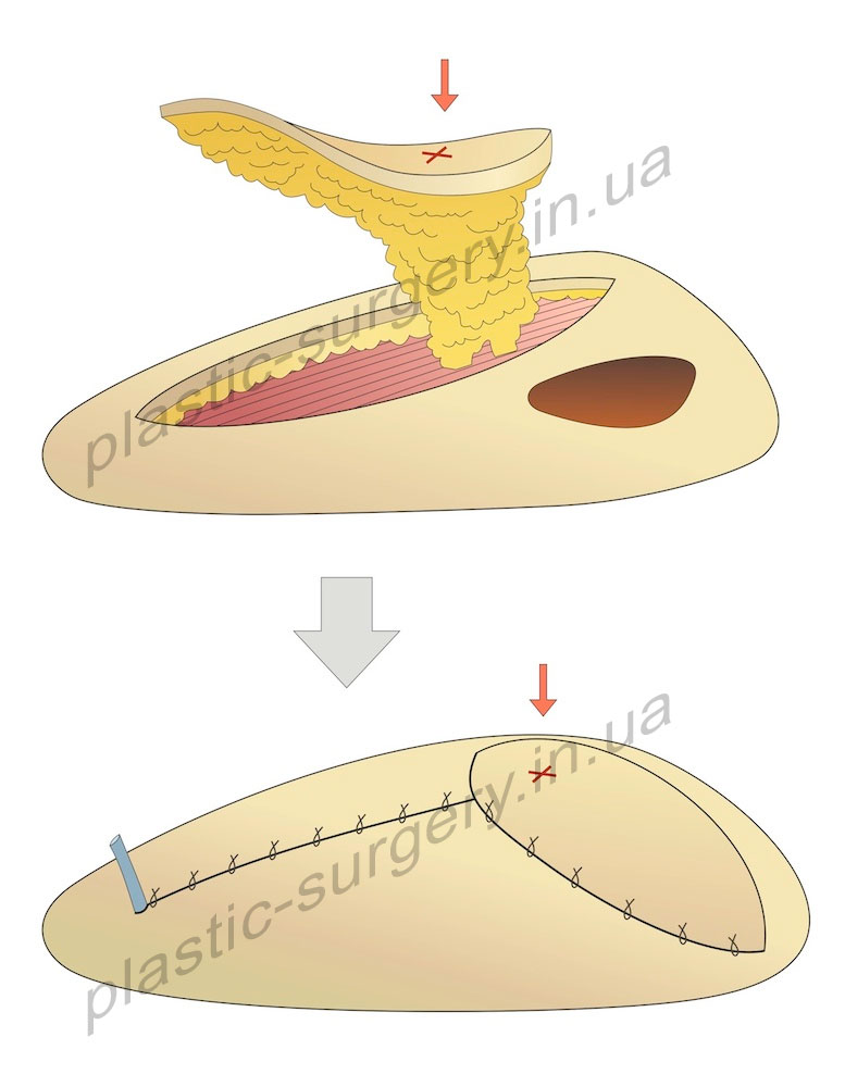 Поэтому, при препаровке лоскута в его состав можно включать кожу и незначительный слой клетчатки, что делает эти лоскуты более изящными по сравнению с известными ранее (Рис.2).