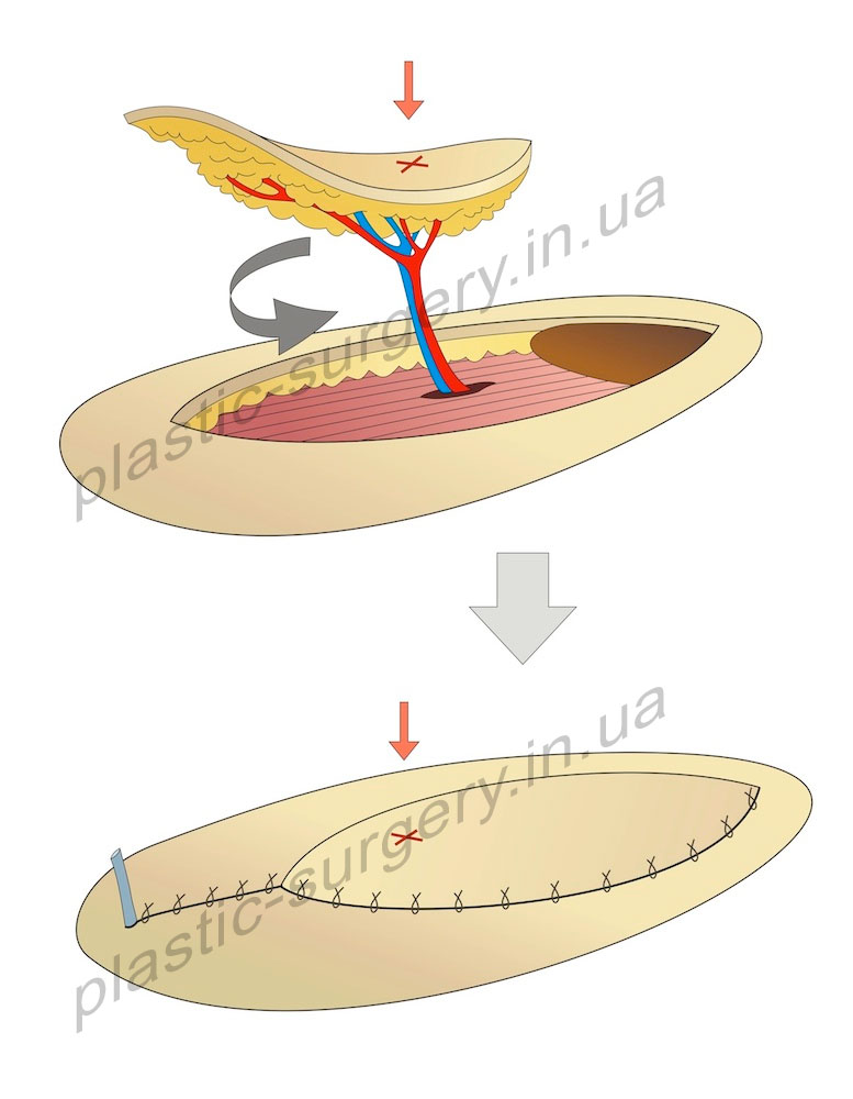 В настоящее время наиболее широко используется техника Pedicle Perforator Propeller Flap (PPPF), когда сосуд питающей ножки не скелетизируют полностью, а оставляют 1-2 см фасциальной перемычки. Это обеспечивает, с одной стороны, не сложную и безопасную ротацию данного лоскута на 180 град. и более, с хорошей адаптацией и без натяжения кожи в реципиентном ложе, а с другой – перемычка защищает сосуд от перегиба или чрезмерного растяжения. Варианты формирования лоскутов по типу питающей ножки представлены на рис.4.