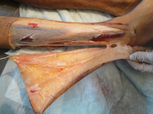 Соответственно способу формирования сосудистой ножки возможно два типа кровоснабжения, однако кожная часть лоскута остается неизменной. Дистальный край лоскута должен доходить до уровня выхода перфорантной ветви малоберцовой артерии, которая может быть найдена путем пальпации в борозде выше и кпереди от наружной лодыжки. Дессекция начинается с переднего доступа, и продолжается до обнаружения перфорантной ветви (рис. 4). Сам лоскут, при этой препаровке, включает кожу, подкожную ткань и фасцию, но поверхностный малоберцовый нерв должен быть сохранен, чтоб избежать нарушения чувствительности на тыле стопы. В некоторых случаях возможно включение ветви этого нерва в состав лоскута для обеспечения чувствительности лоскута, но эта процедура требует наложения шва на нерв в реципиентной зоне [5].