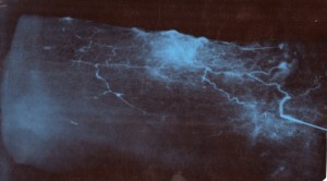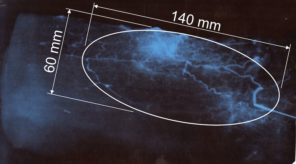 Особенности зоны, кровоснабжаемой из перфорирующей ветви малоберцовой артерии исследовались нами посредством проведения рентгенангиографии на патоморфологическом материале. Были исследованы 16 препаратов лоскутов. Учитывая территорию кровоснабжения исследуемой ангиосомы, которая составляет максимально до 18 см в длину и до 9 см в ширину, кожно-фасциальный лоскут препарировался в несколько больших границах (+ 3 см в длину и ширину), но не выходя за пределы гребня большеберцовой кости [4]. Выделенная перфорантная ветвь малоберцовой артерии зондировалась канюлей на глубину 2-4 см, при затруднении проведения канюли, её проводили по металлическому проводнику 0.014 inch. После этого на артерию поверх канюли накладывался турникет, и герметизировали сосуды по периферии лоскута путем наложения лигатур или методом электрокоагуляции (рис. 2). В ходе подготовки сосудов к контрастированию они промывались раствором гепарина (5 000 Ед / 100 мл). Сосудистое русло заполнялось под давлением йод содержащим контрастным веществом (Ультравист – 370; Визипак – 320), производились рентгенангиографические снимки в нескольких фазах наполнения. С целью определения размеров зоны с устойчивым кровоснабжением от перфорантной артерии (ангиосомы) и её индивидуальной вариабельности, проводили планиметрическое исследование с определением возможных размеров формирования лоскута (рис. 3).