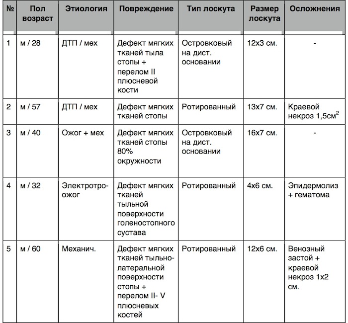В нашей клинике было выполнено 5 операций с использованием латеральных надлодыжечных кожно–фасциальных лоскутов, характеристика которых представлена в таблице 1 и иллюстрирована клиническим случаем из практики.