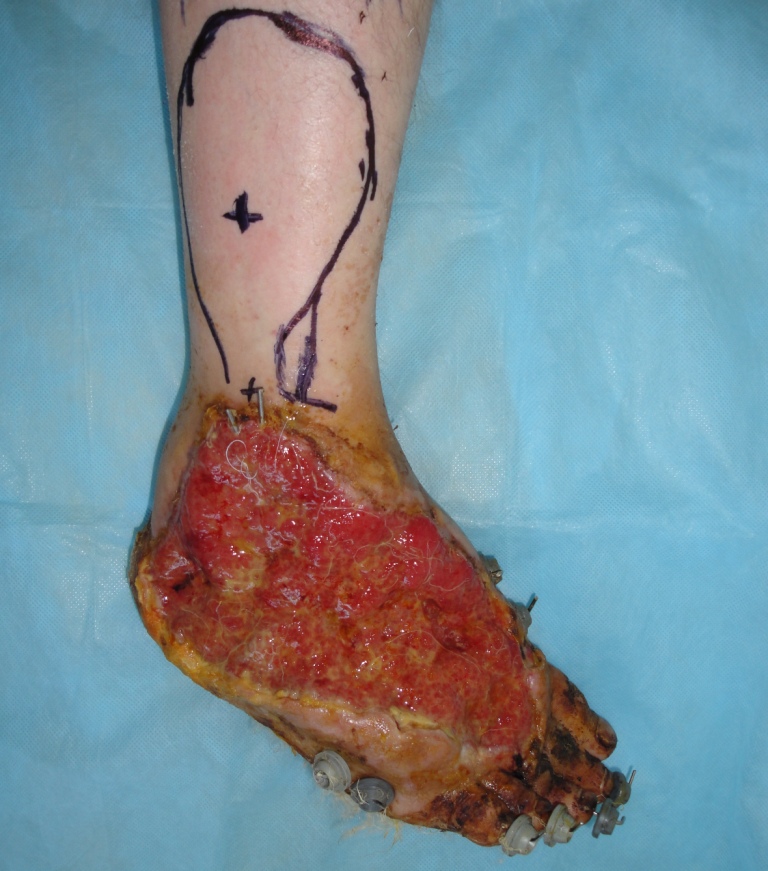 В литературе описано множество различных процедур для закрытия раневого дефекта в области стопы и нижней трети голени. Наиболее часто используемые методы это пластика расщепленным кожным трансплантатом, лоскуты из местных тканей, островковые лоскуты с дистальным или проксимальным основанием, лоскуты на временной питающей ножке из отдаленных областей («Итальянская пластика»), свободные кожно-мышечные лоскуты. Однако эта область по прежнему остается самой проблематичной для закрытия раны. Что связано с довольно большой функциональной нагрузкой, при высокой подверженности нейротрофическим нарушениям, ишемии и травматизации стопы и нижней трети голени. Эти особенности часто ограничивают использование известных методов и постоянно ставят хирурга перед вопросом тактики лечения, возможности сохранения сегмента конечности и методе пластического закрытия [1,2, 3, 4].