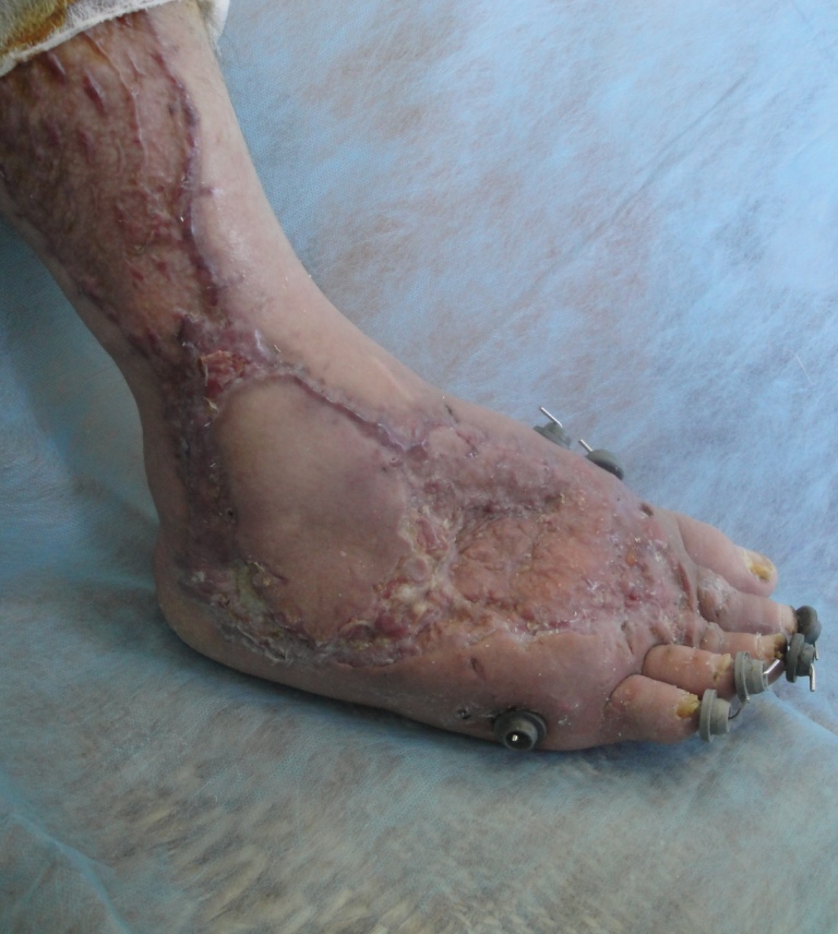 Рис 9. Результат лечения через 2 месяца – восстановлен кожный покров путем приживления кожно-фасциального PPPF лоскута в проекции голеностопного сустава (функциональная зона) и расщепленных трансплантатов на тыле стопы и голени. Функция стопы восстановлена частично. Сохраняется фиксация костей стопы спицами.