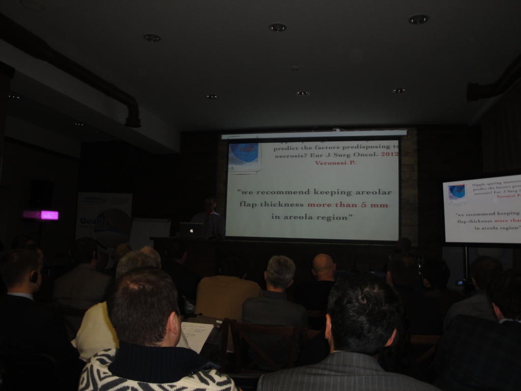 С лекциоонным циклом выступили ведущие хирурги госпиталя “Sandro Pertini” , Рим, Италия, prof. Stefano Pompei и Dr. Fabio Marcasciano. Первая часть лекционного курса была посвящена техникам выполнения подкожной мастэктомии (Skin sparing mastectomy), подкожной мастэктомии с сохранением соска (Nipple sparing mastectomy) и мастэктомии с редукцией кожи (Skin reducin mastectomy).