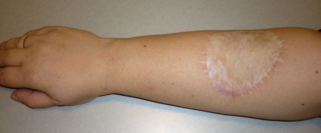Неудовлетворительные результаты могут иметь место при локализации повреждений на лице или других функционально активных областях, где следует учитывать линии натяжения кожи. Если это не было учтено при первичном закрытии раны, возникают проблемы, требующие повторной операции направленной на коррекцию линейного рубца (рис. 3).