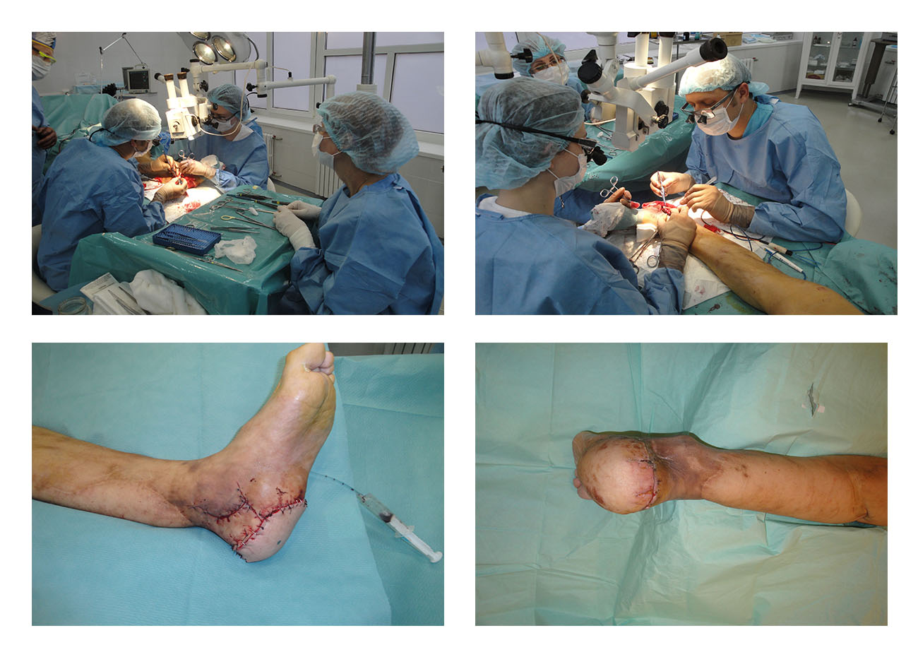 После удаления патологических тканей на пятке и выделения реципиентных сосудов выполнены микрососудистые артериальный и венозный анастомозы, лоскут подшит в область пятки.