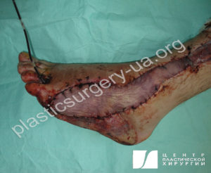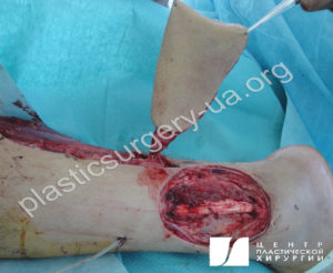швами в заданном положении (рис. 6). После этого лоскут перемещен маневром ротации по типу пропеллер в зону раневого дефекта, где фиксирован к краям раны узловыми швами без натяжения. Донорская рана по задней поверхности голени закрыта путем пересадки кожного аутотрансплантата, толщиной 0,3 мм.