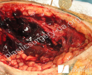 Рис. 2. Гематома в подкожной клетчатке подлоскутного пространства.
