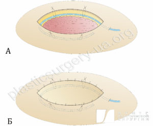 Рис. 3. Схема фиксации вакуумного дренажа чрезкожными швами по периметру раневого дефекта с максимальным приближением к линии разреза и шва. Вид раневого дефекта до закрытия лоскутом (А) и после закрытия лоскутом (Б).