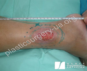 Рис.4. Вид новообразования на левой голени и раны в виде изъязвления при поступлении в клинику. Маркером нанесены уточненные границы иссечения для радикального хирургического лечения.