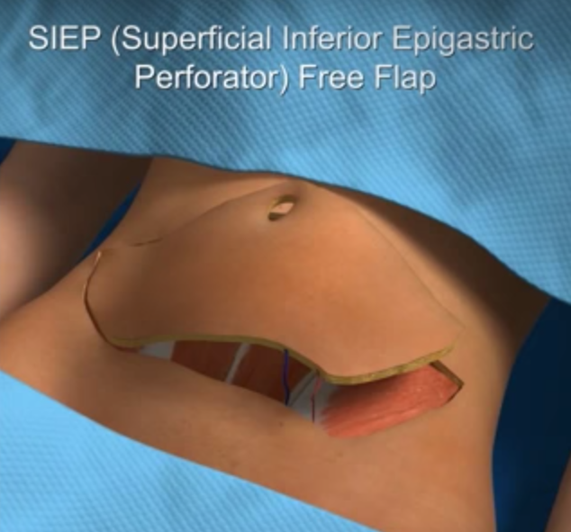 Если во время операции становится понятным, что основное кровоснабжение этих тканей происходит в основном за счет поверхностной нижней надчревной артерии и вены, то хирург может сформировать SIEP лоскут. Этот лоскут идентичен DIEP и отличается только питающим сосудом, а так же является более щадящим для области живота, так как нет необходимости открывать глубокую мышечную фасцию (Рис 2, 3.).
