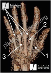 Рис. 1. Компьютерное томографическое исследование (КТ) с ангиографией кисти, демонстрирующее: 1) первую тыльную метакарпальную артерию, 2) вторую тыльную метакарпальную артерию, 3) третью тыльную метакарпальную артерию, 4) перфоранты тыльных метакарпальных артерий.
