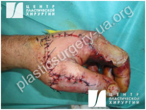Рис. 9. Выполнена реконструкция первого межпальцевого промежутка, донорское место закрыто расщепленным кожным трансплантатом.