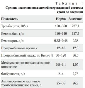 На этапе подготовки к хирургическому вмешательству выполнены лабораторные исследования крови и показателей свертываемости (табл. 1).