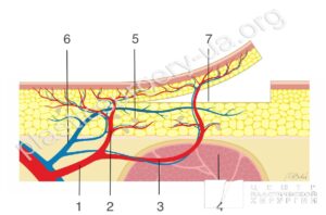 Рис. 2. Схематическое изображение ключевых анатомических структур при формировании SCIP лоскута. 1 – поверхностная артерия огибающая подвздошную кость, 2 – поверхностная ветвь поверхностной артерии огибающей подвздошную кость, 3 – глубокая ветвь поверхностной артерии огибающей подвздошную кость, 4 – портняжная мышца (m. sartorius), 5 – паховые лимфатические узлы, 6 – поверхностная периферическая подвздошная вена, 7 – поверхностная фасция.