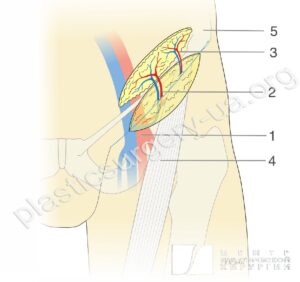 Рис. 1. Схематическое изображение анатомии SCIP лоскута. 1 – бедренная артерия, 2 – поверхностная ветвь поверхностной артерии огибающей подвздошную кость, 3 – глубокая ветвь поверхностной артерии огибающей подвздошную кость, 4 – портняжная мышца (m. sartorius), 5 – верхняя передняя ость подвздошной кости.
