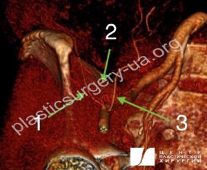 Рис. 3. КТ ангиография при планировании SCIP лоскута: 1- глубокая ветвь поверхностной артерии огибающей подвздошную кость, 2 – поверхностная ветвь поверхностной артерии огибающей подвздошную кость, 3 – поверхностная нижняя эпигастральная артерия.