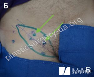 Разметка лоскута производится в положении пациента на спине. В паховой области проводится условная линия от медиального края паховой складки к верхней передней ости подвздошной кости, эта линия является осью лоскута. Далее эта линия делится на три равные отрезка вертикальными линиями и именно в средней трети как правило можно найти перфоранты поверхностной ветви возле медиальной границы и перфоранты глубокой ветви возле наружной границы (Рис. 4 а,б). С помощью допплера проводится оценка перфорантов, определяется доминантный перфорант, особенности кровотока.