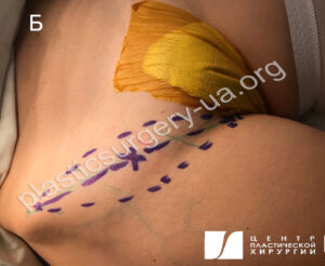 Рис. 6. Донорская зона. А – донорское место, зажившее первичным натяжением, состояние рубца через 3 месяца, Б – донорское место скрываемое под нижним бельем.